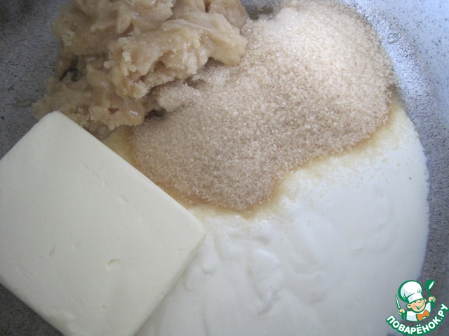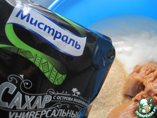 Сметану соединяем с вареной сгущенкой и сахарам. -