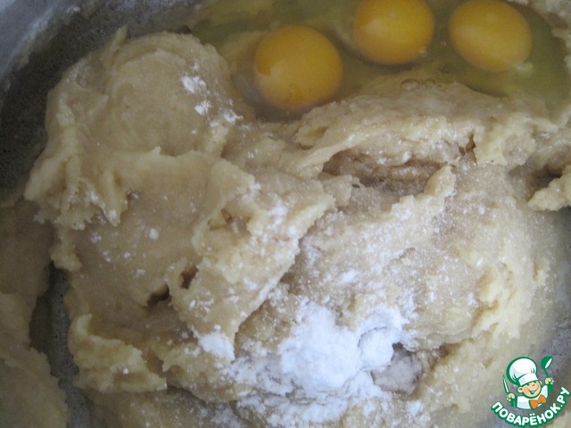 Вводим яйца, соду и всыпаем муку.