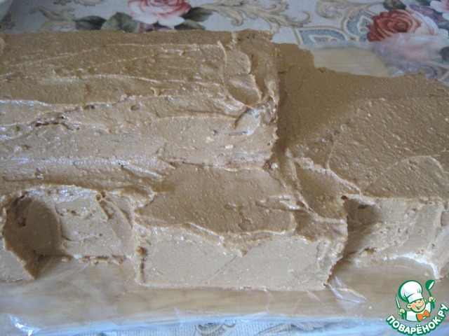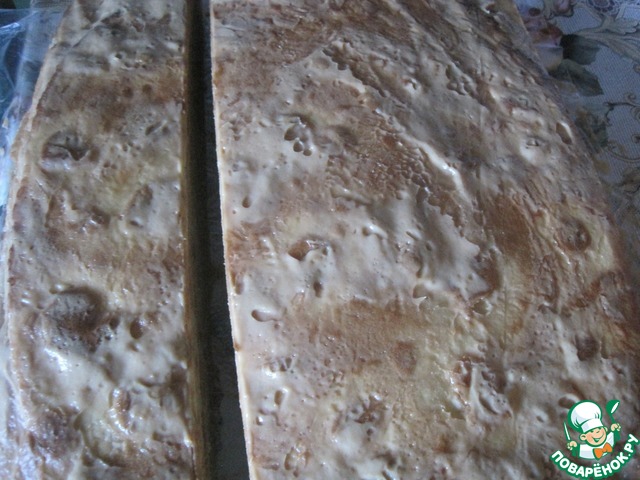 Готовый медовый, пропитанный пласт разрезаем по размеру грузовика.