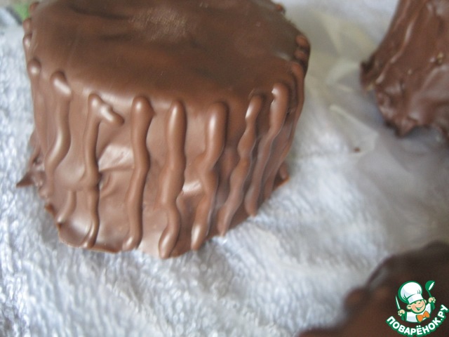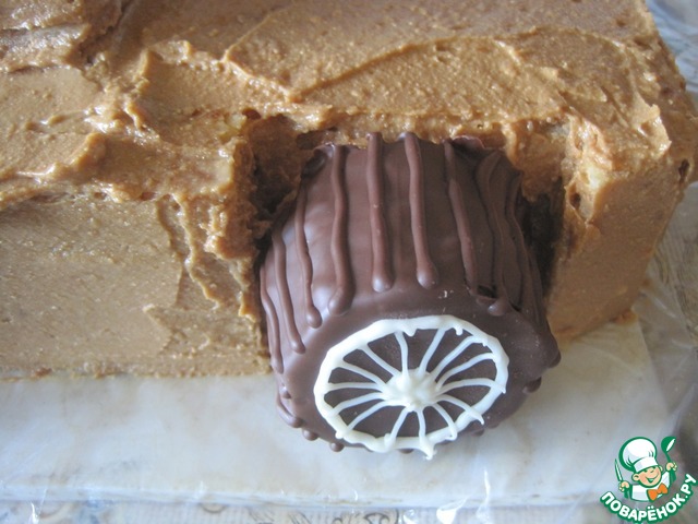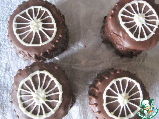 Колеса поливаем растопленным темным шоколадом, из корнетика рисуем полоски.