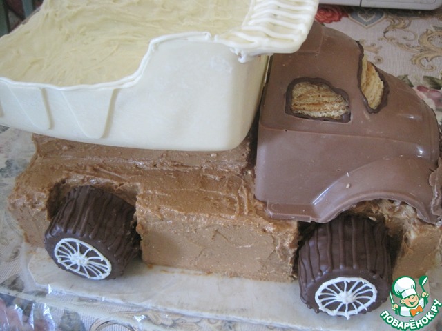 Растопленным белым шоколадом обмазываем кузов грузовика, даем застыть.