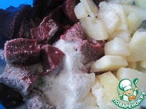 Темное, упругое мясо говяжьего сердца замечательного вкуса дополняется сладковатым ароматом ананаса (приготовленного из кабачка). Никто не догадается, что вы заменили консервированный ананас на кабачок и получат наслаждение от сочетания сладкого "Лже- ананаса" с мясом.
