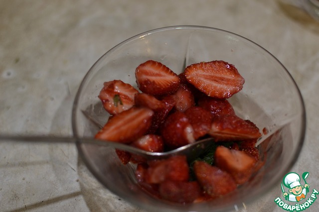 Режем клубнику на половинки, часть слегка разминаем, часть оставляем половинками.