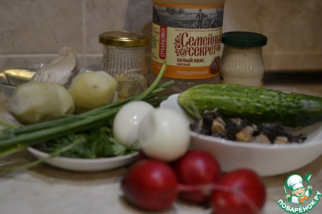 Смешиваем все ингредиенты, накладываем в порционные тарелки и заливаем в нужной пропорции квасом.