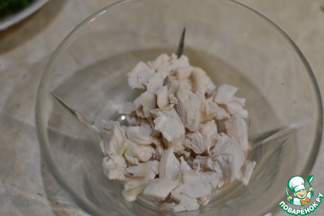 Курицу режем мелко, огурец натираю на терке, лук и зелень измельчаем