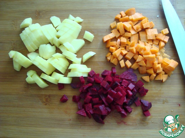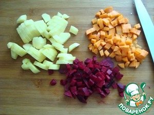 Картофель, свеклу 1 шт и морковь 1 шт режем мелким кубиком или произвольно как вы любите. -