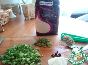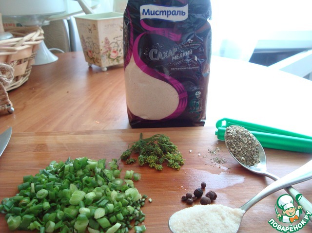 Для заправки борща я взяла свои любимые специи для овощей, душистый перец, лавовый лист, лук и укроп порубленный, сахар мелкий тростниковый от ТМ МИСТРАЛЬ, уксус 9% и бальзамик, подсолнечное масло.