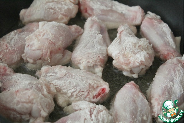 Сковороду нагреть, влить масло и обжарить с каждой стороны на среднем огне по 5 минут крылышки - они должны остаться бледными!!!