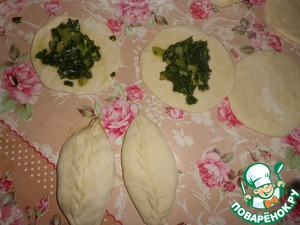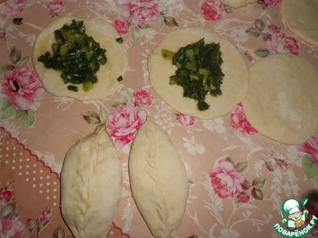 Тесто раскатать на припыленной мукой поверхности, вырезать из теста кружочки, выложить на них по 2 ч. л. начинки. Защипнуть пирожки.