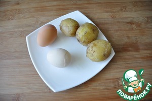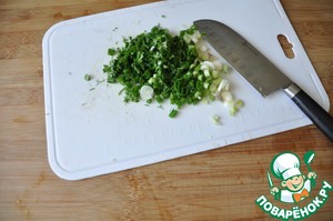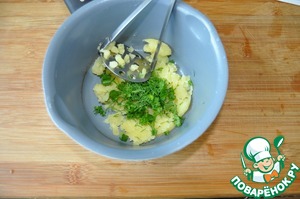 Картофель чистим и вместе с половиной нарезанной зелени разминаем толкушкой.
