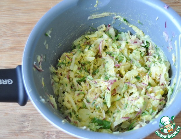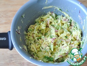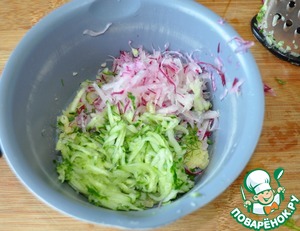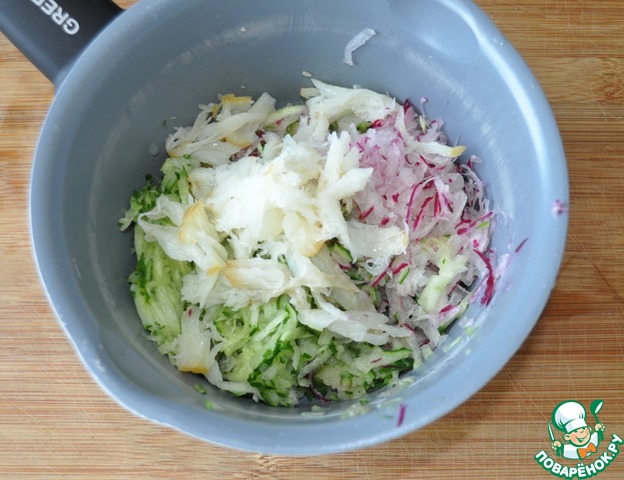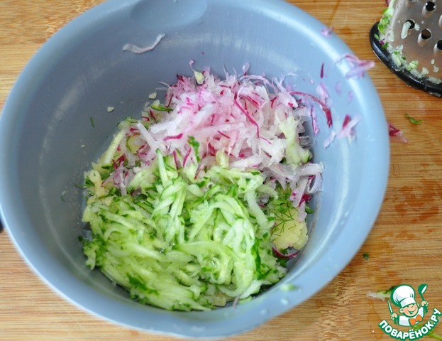 Добавляем к картофелю натёртые на тёрке огурец и редис.