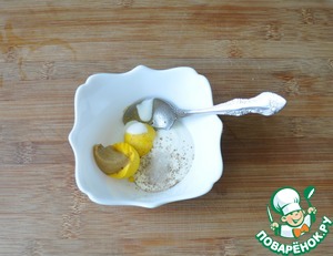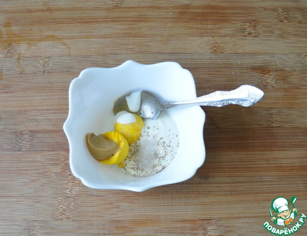Готовим заправку. Яйцо чистим, желток перетираем с горчицей, сметаной, солью и чёрным перцем.