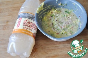 Заправку смешиваем с остальными составляющими окрошки. Должна получиться однородная масса.