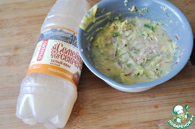 Заливаем окрошку охлаждённым квасом "Семейный секрет" традиционный ТМ "Очаково". Перемешиваем.
