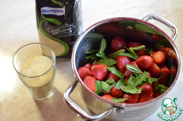 В кастрюльку выложить клубничку, мяту разобрать на листочки. Засыпать сахаром.