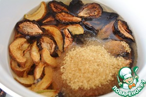 В кастрюльку закладываем наши сухофрукты, насыпаем сахар - именно коричневый!