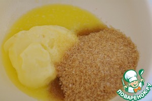 К размягченному сливочному маслу добавить 80 г коричневого сахара - взбить миксером