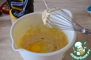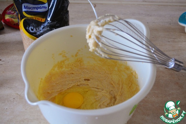 Добавляем яйцо и щепоть соли - взбиваем, чтобы сахар разошелся.