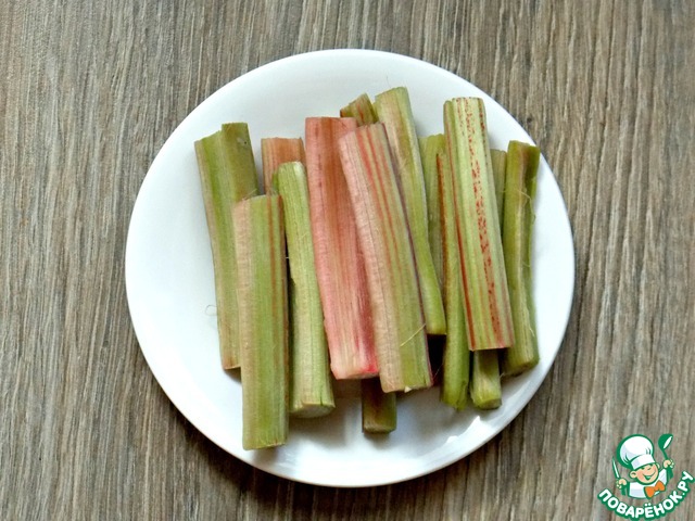• Тем временем вымыть и очистить ревень от верхней кожицы. Нарезать на куски 6-7 см.