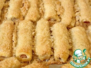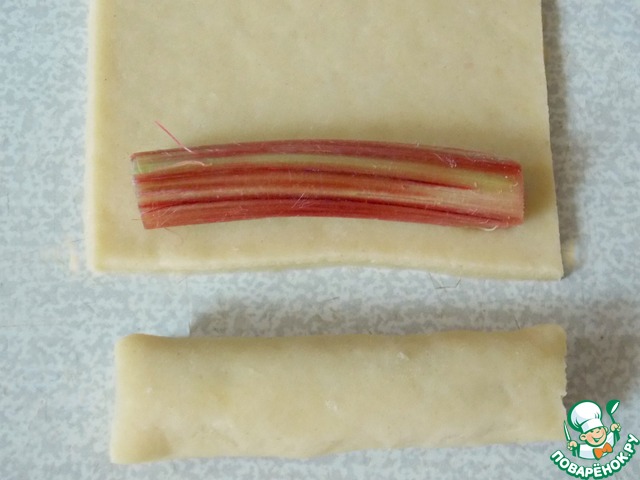 • Вынуть тесто и раскатать в пласт толщиной 5 мм. Нарезать полосками шириной как кусочки ревеня. Положить ревень на край, и заворачиваем его в тесто в один оборот. Отрезать лишнее и закрепить края над ревенем. Прокатать по столу для придания формы.