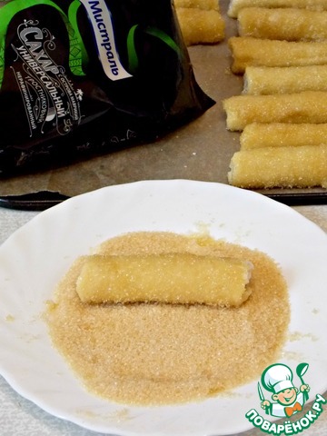 • Белок немного взболтать вилкой до легкой пены. Каждое печенье обмакнуть в белок и обвалять в сахаре "Универсальном" от "Мистраль".
