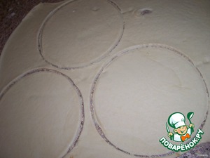 Готовое тесто делим на части, раскатать в тонкий пласт, вырезаем круги по десертной тарелке.