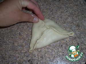 Кладём готовый фарш на серединку, закладываем тесто как треугольник.