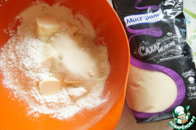 В чашу насыпать муку, положить холодное рубленое масло, добавить сахар. Растереть все в крошку при помощи рук.