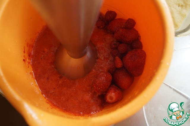 Желатин залить холодной водой и дать набухнуть. Затем поместить в микроволновку и растворить желатин полностью (либо сделать это при помощи водяной бани). Добавить желатин к клубничному пюре. Перемешать. -