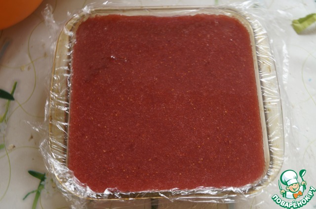 Застелить форму, где выпекался корж, пищевой пленкой, выложить корж, залить клубничным желе и убрать в холод до полного застывания желе.