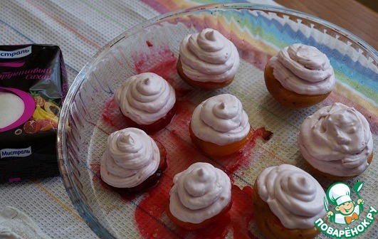 • С помощью кондитерского шприца выложите белковую массу на половинки фруктов.