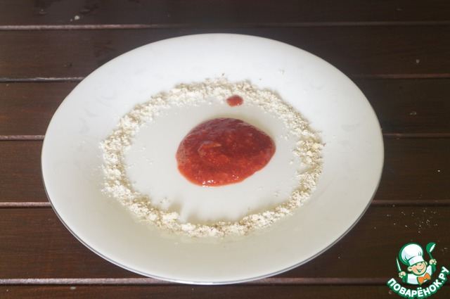 Измельчить миндаль, выложить его по кругу на тарелку, затем положить немного клубничного соуса, разровнять.