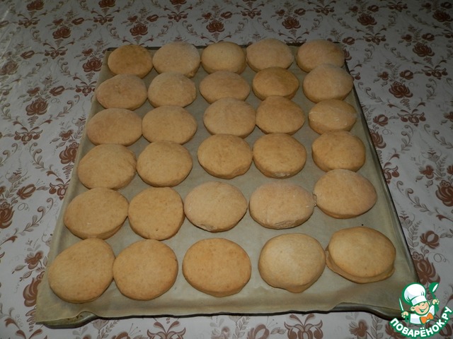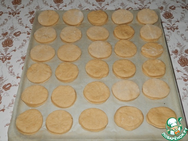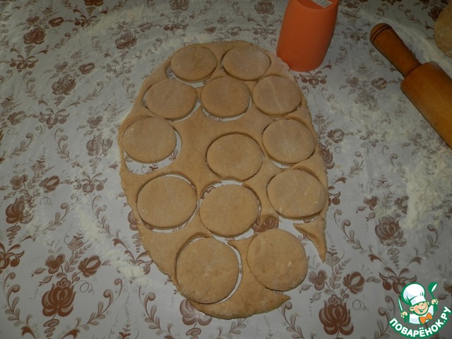 Раскатать тесто, толщиной 0,7 – 0,8 см, вырезать стаканом кружочки.