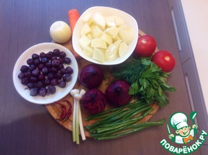 Подготовить овощи. Борщ можно варить с мясом, можно и без. В нем много свеклы и овощей, без мяса получается не менее вкусно. В мясной бульон или в кипящую воду добавить картофель.