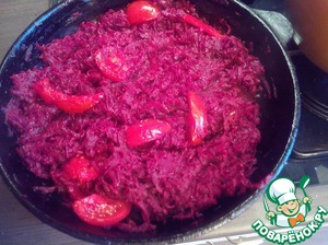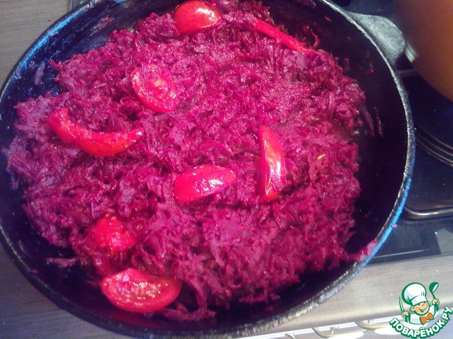 Пока варится картофель, пассеруем лук, морковь и натертую свеклу. Когда овощи размягчаться добавляем порезанные дольками помидоры или томатную пасту, все вместе тушим 2-3 минуты. Осенью и зимой я свеклу отваривают, натираю и закладываются непосредственно в борщ. Пассерую только молодую, раннюю.