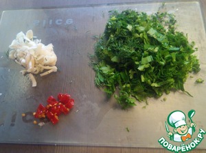 Затем добавляем рубленый чеснок, перец чили, мелко нарезанную петрушку и укроп. Доводом до кипения и выключаем.