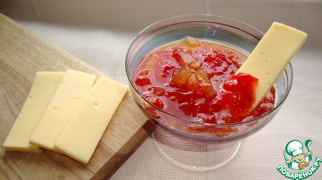 Горячий джем разложить по стерилизованным банкам и закрыть. Джем идеально подходит к сыру и рыбе. При подаче джем обязательно охладить!!!