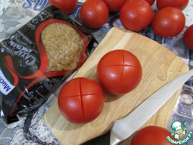 Помидоры помыть, обсушить. Сделать на них надрезы крест-накрест. В глубокой кастрюле вскипятить воду. Выключить огонь. Опустить помидоры в кипяток на 30-40 секунд. Затем обдать холодной водой.