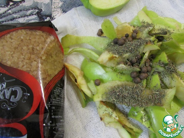 Положить кожуру и сердцевину яблок в мешочек из двух слоев марли, добавить тимьян (у меня сухой) и душистый горошек. Прочно завязать мешочек.