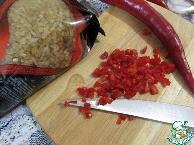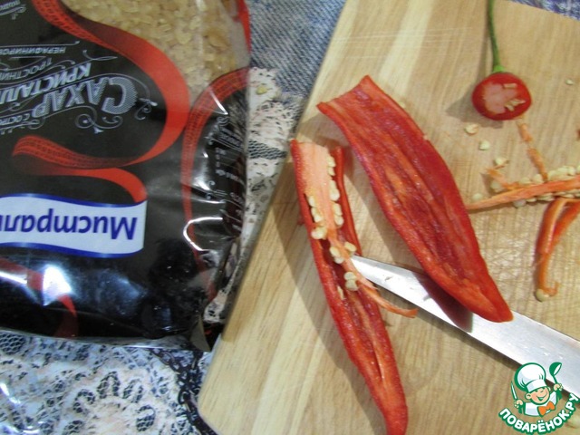 Перец чили помыть, обсушить. Разрезать вдоль. Обязательно удалить плодоножку, семечки и все перегородки (любителям острого можно этого не делать).