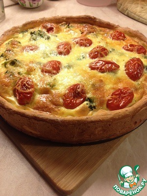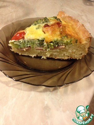 Пока основа тарта печется, занимаемся начинкой. Сосиски нарезаем кружочками, помидоры разрезаем пополам вдоль, брокколи отвариваем или готовим на пару 10 минут. Для заливки смешиваем 4 яйца, пол ч. л. соли, сметану и столовую ложку муки без горки. Все хорошо взбиваем венчиком, чтобы не было комочков. Затем вынимаем форму с тестом и на дно выкладываем сосиски, затем брокколи, порезанную на небольшие кусочки, выливаем заливку, сверху выкладываем помидоры и посыпаем сыром. Ставим в духовку и выпекаем до зарумянивания примерно 30 минут на 180 градусах. Диаметр моей формы 26 см.