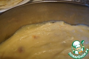 Крем уваривала в микроволновке на максимальной мощности, каждую минуту открывая и помешивая. И сделала половину от указанного в рецепте - как раз хватило, хотя мазала достаточно щедро и торт получился влажным, как и полагается.