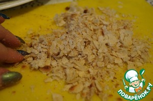 Оставшиеся обрезки теста подсушиваем на той же сковороде и разминаем в крошку. Делаем это пальцами или скалкой. Чтобы крошек было достаточно, можно раскрошить дополнительно кусочки печенья или предварительно оставить самый несуразный и маленький корж для последующего его раскрошения.