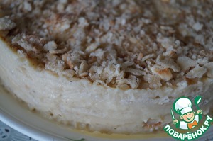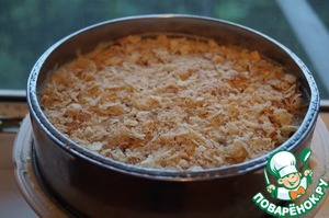 Посыпаем крошками наш торт сверху. И убираем наше сооружение в холодильник. Лучше на ночь, чтобы торт хорошо пропитался.