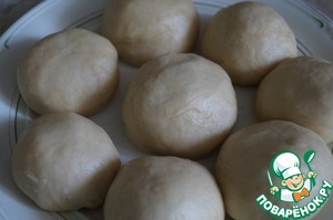 Делим тесто на 8-9 кусочков. Скатываем шарики и укладываем на большую тарелку, слегка опылённую мукой. Убираем на 1 час в морозильник. Сразу оговорюсь, что это время - условно. Тесто можно приготовить заблаговременно. Или использовать раньше часа. Не имеет особого значения. Просто с прохладным тестом работать легче.