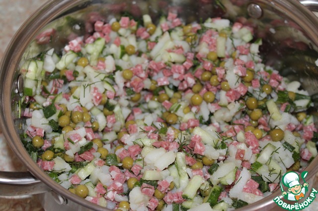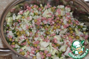 Добавить горошек, измельчённые укроп и зеленый лук.