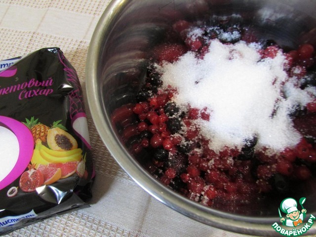 Тем временем в сотейник положить красную смородину, добавить сахар Мистраль фруктовый, воду и довести до кипения.