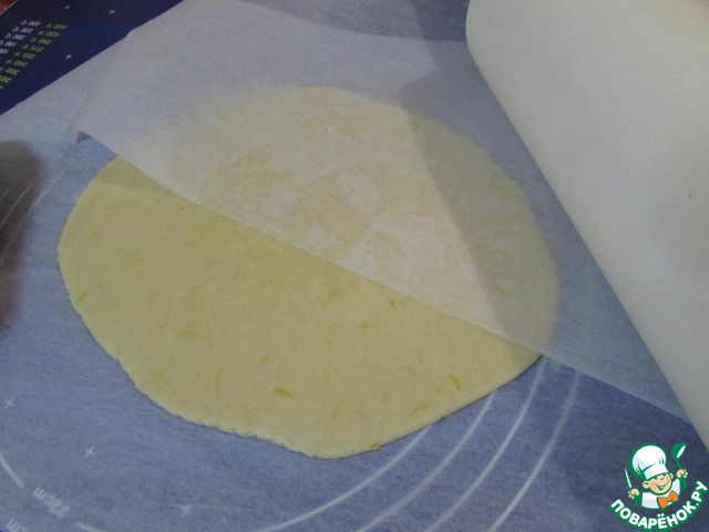 Через 15 минут раскатать тесто между двумя листами пергамента в пласт толщиной 4 мм.