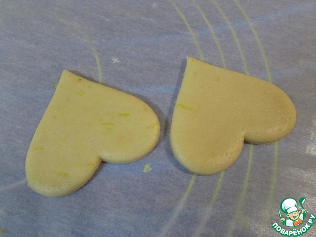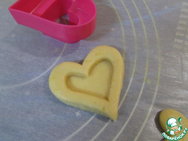 А другую половину разложить на рабочей поверхности. Формочкой поменьше вырезать из них сердечки-серединки.