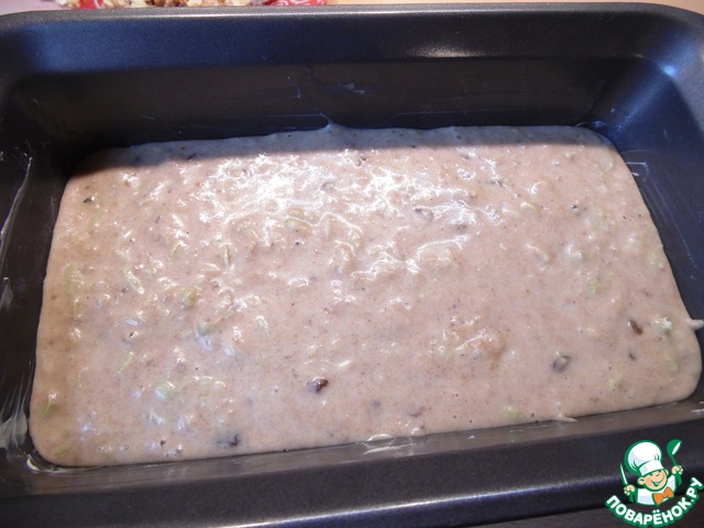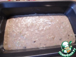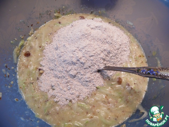 Яично-масляную массу смешать с кабачковой, добавить просеянную с разрыхлителем муку, замесить негустое тесто.